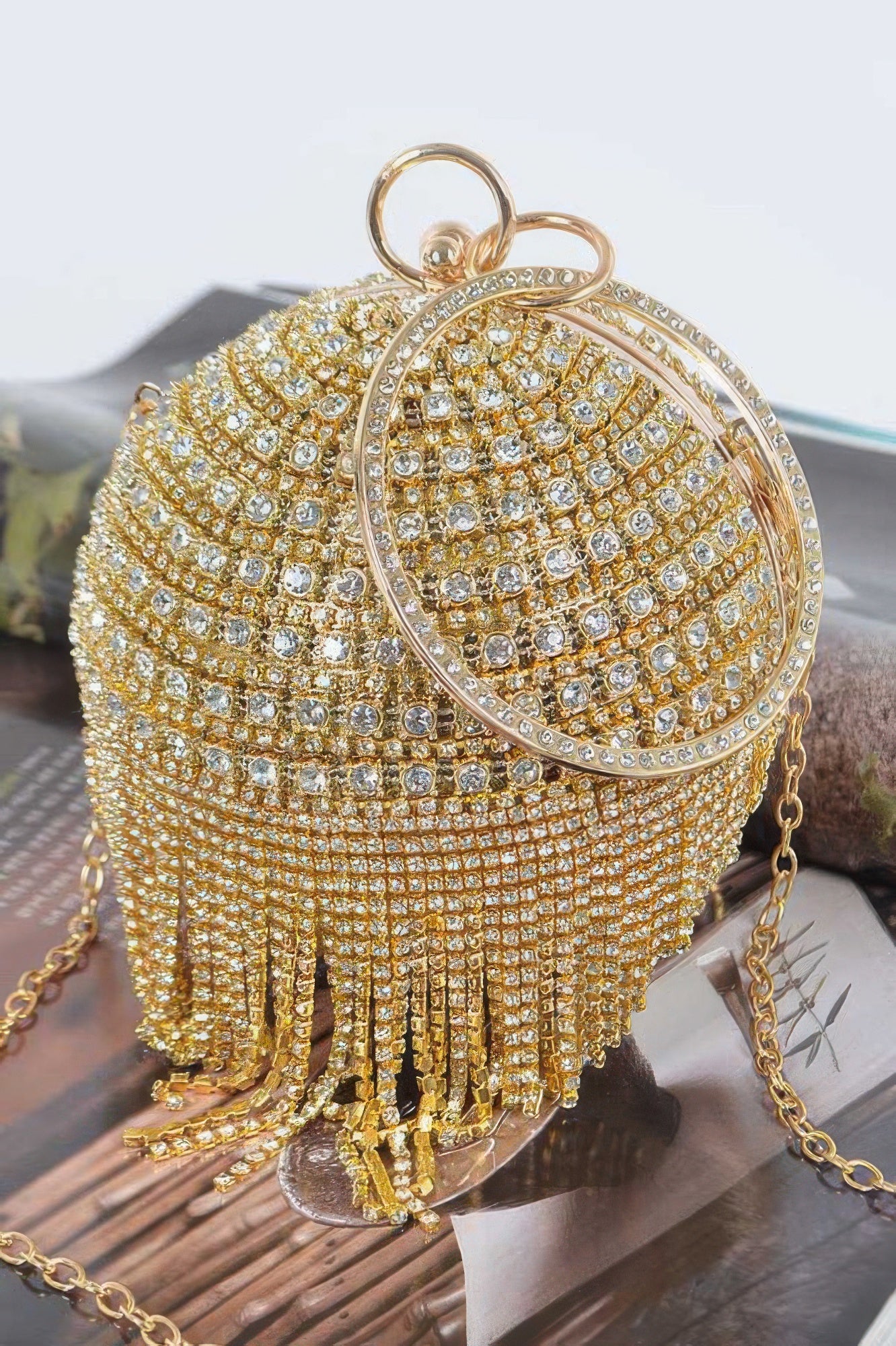 Product Description: Sparkling from every angle, the Round Rhinestone Fringe Bag is a bold accessory that instantly elevates your ensemble. Designed with a fully rhinestoned finish and dynamic fringe, it captures movement and light beautifully. The rounded silhouette is compact and structured, ideal for carrying just the essentials. Whether styled with a gown or modern jumpsuit, this piece brings a glamorous finishing touch. Pair it with minimal jewelry and let the bag shine.