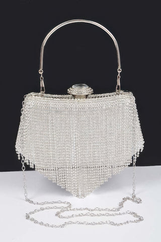 Product Description: This rhinestone fringe party clutch delivers dramatic sparkle with movement. Designed with a slim, structured profile, it features cascading fringe that catches the light beautifully. Compact in size, it holds essentials while making a bold statement. Lightweight construction ensures comfortable carry. A standout accessory for evening events.