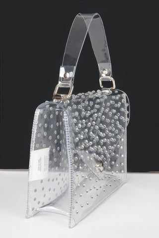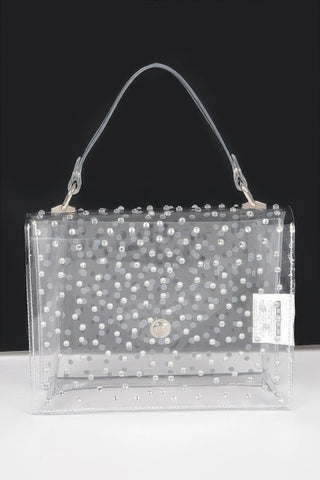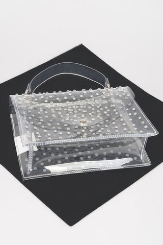 Product Description: Bring sparkle and structure to your accessories with the Rhinestone Hot Fix Clear Crossbody Bag. Made from durable PVC and adorned with dazzling rhinestones, this compact bag blends edge and glamour in one modern silhouette. With its clear body and structured shape (8.25W x 6H x 2.5D), it's perfect for concerts, events, or nights out. The mixed metal hardware adds polish while maintaining versatility across outfits.