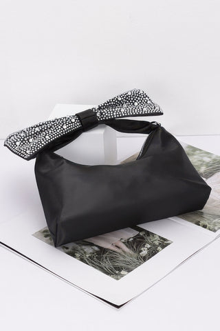 Rhinestone Hotfix Bow Handle Nylon Clutch - Black