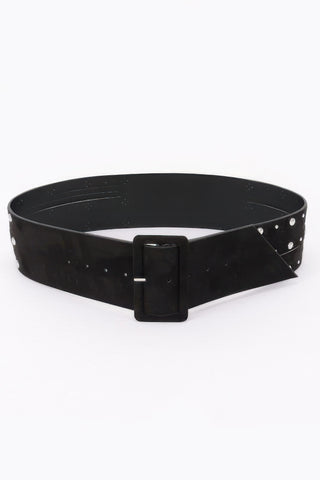 Product Description: The Wide Studded Buckle Belt makes a bold impact with its edgy, structured design. Featuring a 3" wide band and detailed with prominent studding and a statement buckle, this PU belt is built to turn heads. Its 43" length offers flexibility in styling, making it perfect for layering over blazers, jackets, or bodycon looks. The thick silhouette brings balance and contrast to softer outfits, while the studs inject a confident, rocker-chic vibe. A must-have for night outs or style-forward moments.