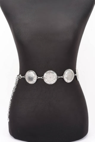 Product Description: Bring retro elegance to your ensemble with the Vintage Metal Chain Belt. This design features ornate metal discs connected by a flowing chain structure, capturing a timeless bohemian aesthetic. Measuring 2" in width and 45" in length, it adds dramatic texture while comfortably cinching the waist. Whether worn with flowing maxi dresses or tailored trousers, it offers a vintage-inspired accent that’s both bold and chic. Ideal for themed parties or daily statement dressing.