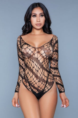 Product Description: The 1996 Let Me Love You Bodysuit delivers a bold visual impact with its unique slanted web pattern and sleek off-shoulder silhouette. Available in classic black or a striking rainbow option, this statement piece is designed for fearless expression and confident styling. The sheer construction and long sleeves add balance, while the body-skimming fabric ensures a sultry, second-skin fit. A captivating addition to your lingerie drawer or styled beneath bold outerwear.