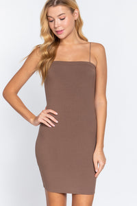Imported S.M.L STRAIGHT NECK CAMI ELASTIC STRING HEAVY RIB MINI DRESS 90% Rayon 10% Spandex Slit Brown ACT