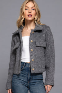 Stay warm and stylish with our Long Sleeve Teddy Fleece Short Jacket, a cozy addition to your wardrobe that���s perfect for chilly days. This button-down jacket features soft teddy fleece for ultimate comfort and a trendy look. Key Features: Fabric: Made from one hundred percent polyester for a plush, cozy feel Fit: Available in small, medium, and large, designed for a relaxed yet flattering silhouette Color Options: Available in Heather Charcoal Design: Features long sleeves and a button-down front, offering both warmth and style Versatile Styling: Perfect for layering over tees or sweaters, this jacket is ideal for casual outings or lounging