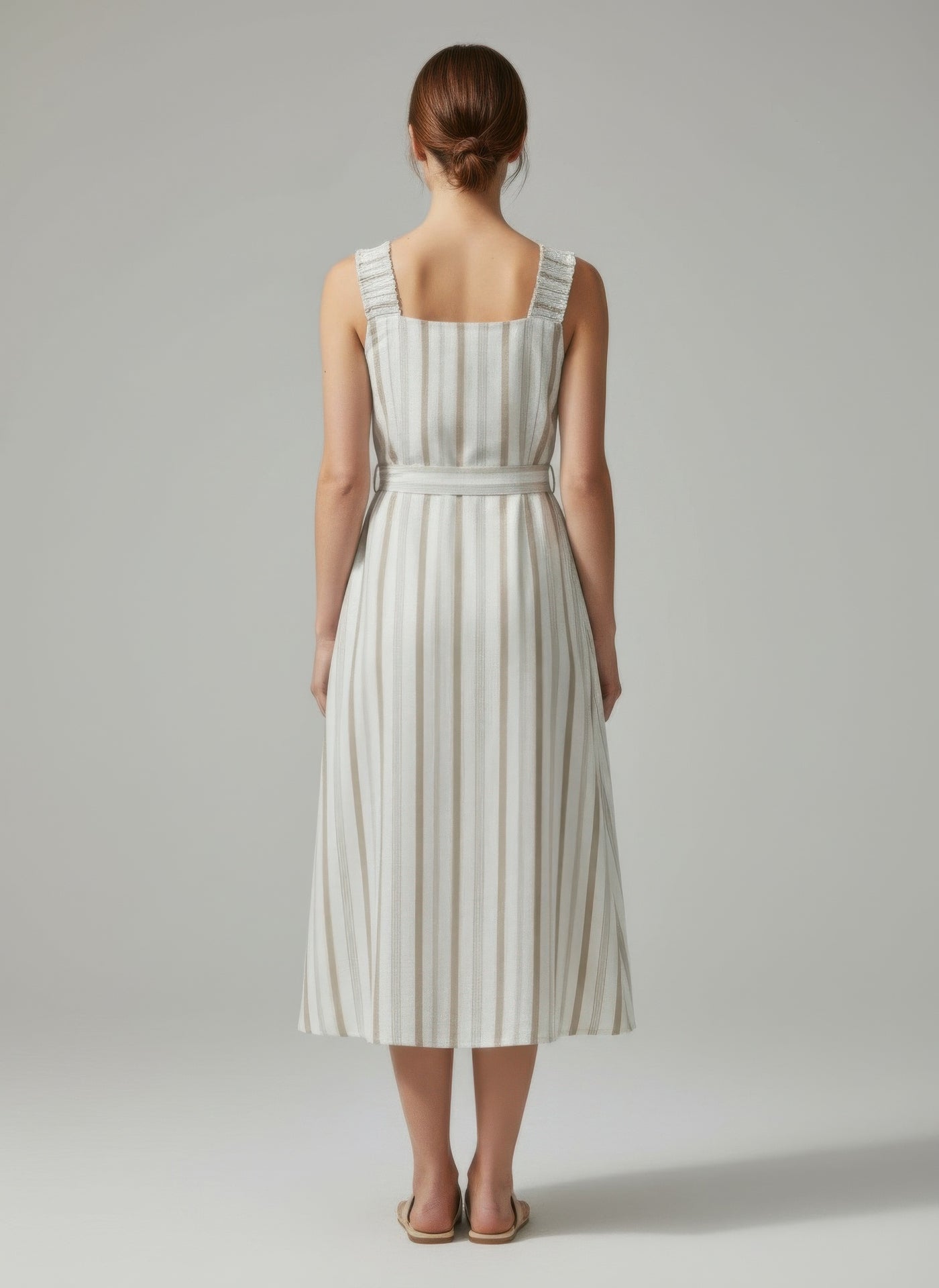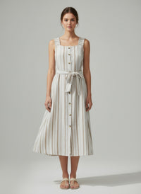 Product Description: Effortlessly chic and timeless, this Mlle Gabrielle striped dress is designed for easy everyday elegance. Crafted from 100% cotton, it offers a breathable and lightweight feel that’s perfect for warm-weather wear. The sleeveless button-down front creates a classic, structured look with a modern touch. A front tie detail adds feminine shape and allows for a flattering, adjustable fit at the waist. Functional front pockets bring a practical yet stylish element to the design. Finished with a back elastic panel for added comfort and flexibility, this dress blends comfort and polish in one versatile piece.