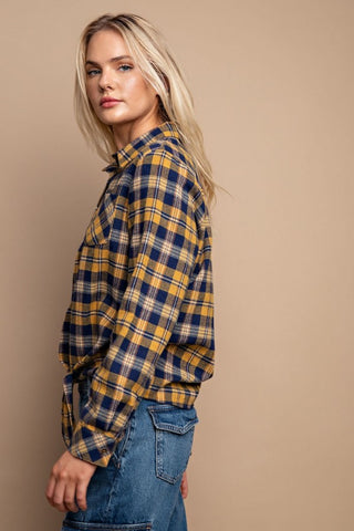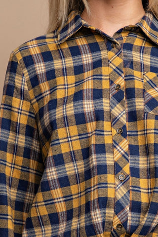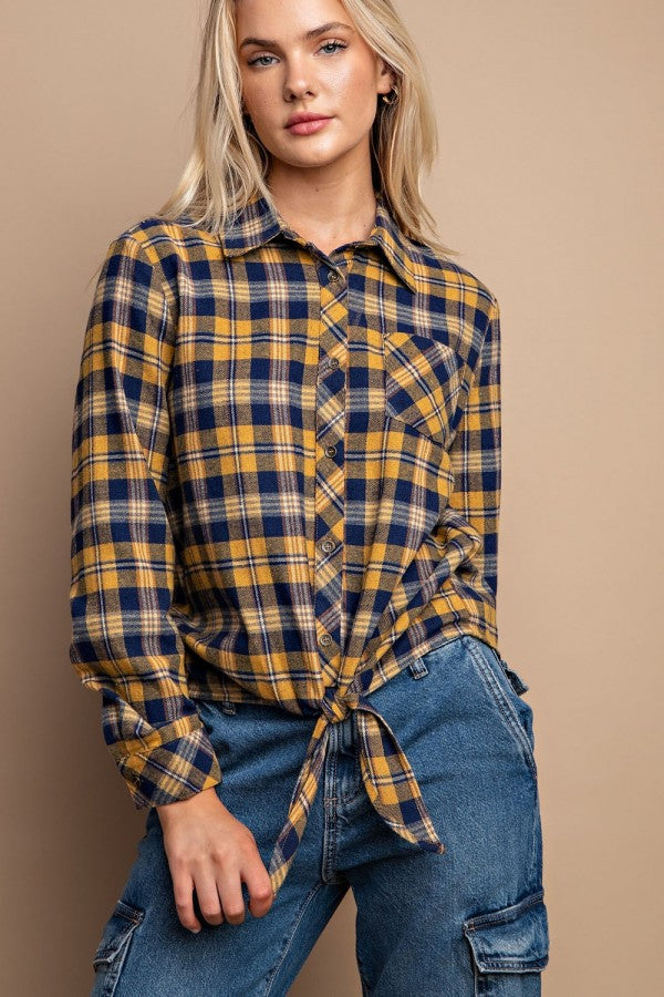 Tie Front Button Down Plaid Shirt With Front Pocket - L