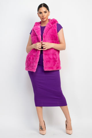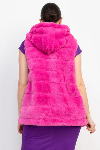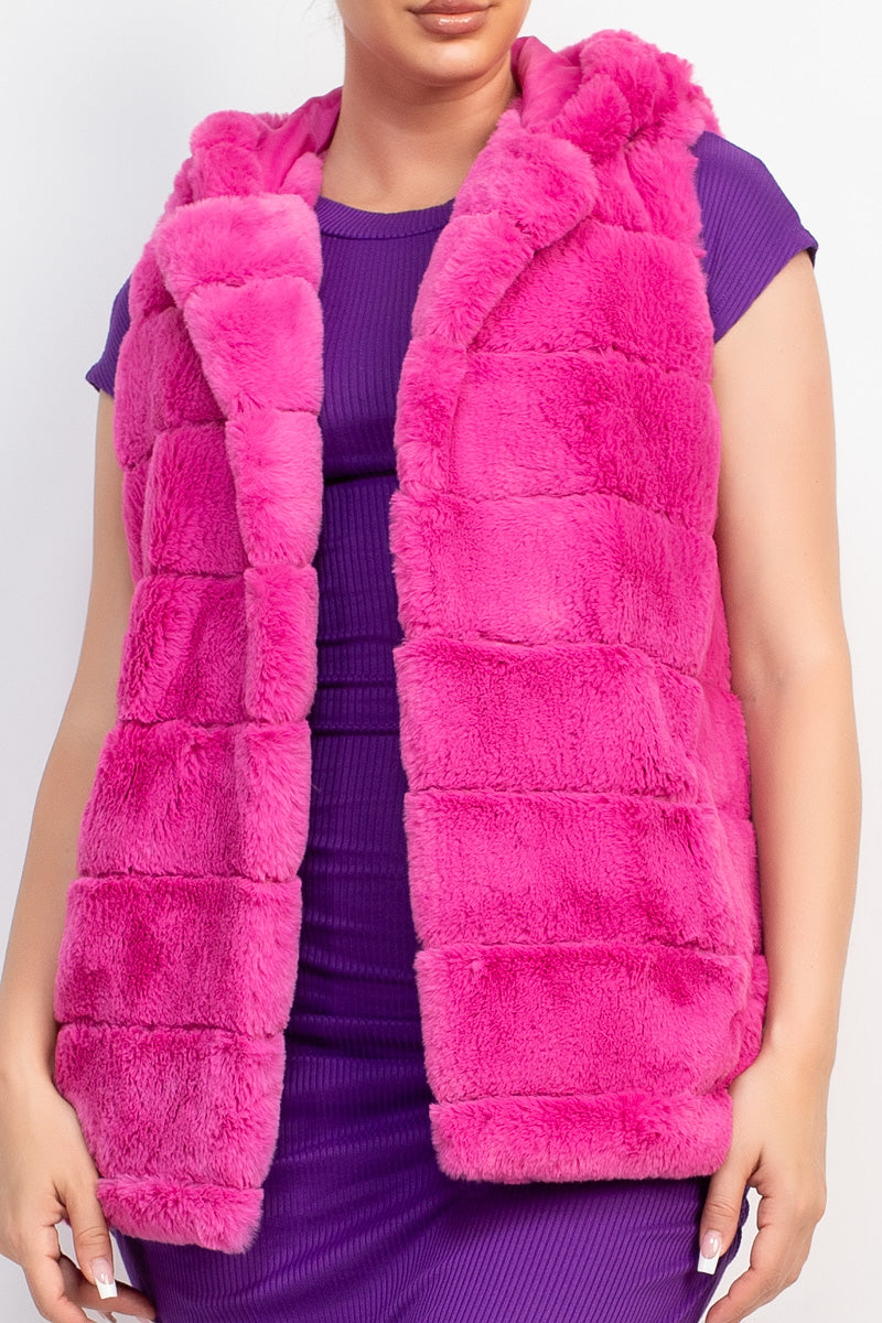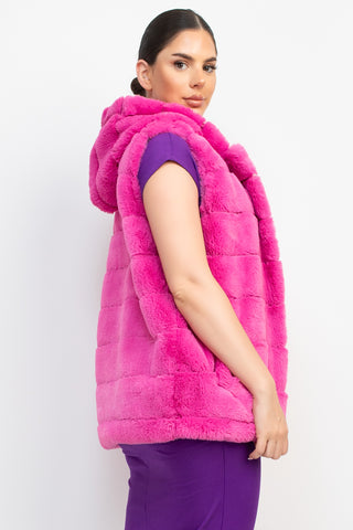 Imported S.M.L A woven vest in a faux fur fabric featuring a quilted design, sleeveless, notch collar, hoodie, and waist length. 100% Polyester Fuchsia IRI