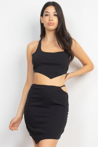 Imported S.M.L A solid tank top featuring a scoop neckline, sleeveless, cropped, crossed-back details with drawstring self-te, and an asymmetrical hem. A fashion skirt in a solid color featuring a high waist, side cutout, mini length, and asymmetrical hem. 72% Rayon 24% Nylon 4% Spandex Black IRI