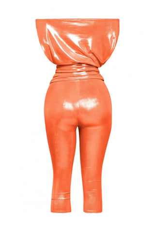 Product Description: Make a statement in this loose fit shimmer top and capri set, designed for a comfortable yet stylish look. The sleeveless top features an asymmetrical cut and a sleek, pull-on style, creating an effortless silhouette that drapes beautifully. The capri bottoms are equally chic, designed with an elastic waistband for an easy, flexible fit and a straight hem for a polished finish. Made from a soft, stretchy blend of 95% polyester and 5% spandex, this set ensures comfort and a flattering fit without compromising on style. Perfect for casual days or adding a touch of shimmer to your everyday wear.