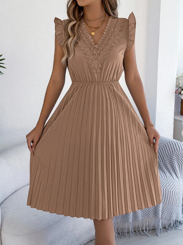 Lace Detail Ruffled Cap Sleeve Pleated Dress Sale