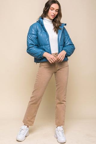 Pu Faux Leather Zipper Hooded Puffer Jacket Sale