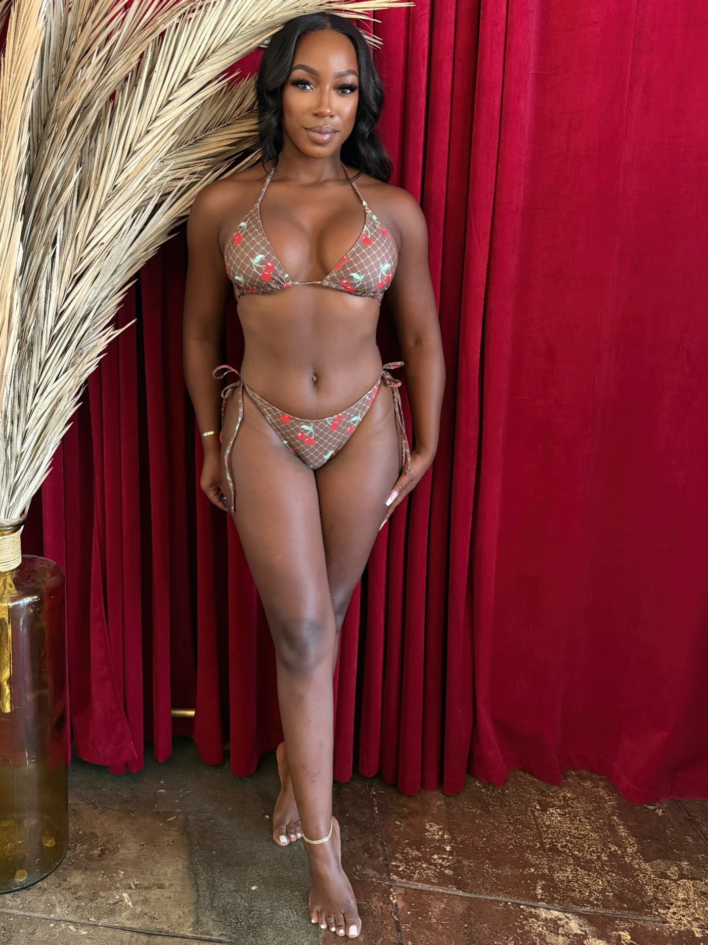 Product Description: The Cherry Dream Bikini Set brings a flirty twist to classic swimwear with its rich brown base and playful cherry print. Designed for both comfort and style, the triangle top features adjustable halter straps while the tie-side bottoms offer a customizable fit that flatters every curve. Made from a soft, stretch-infused fabric, this bikini set moves with you and hugs the body in all the right places. Its sweet-meets-sultry aesthetic is perfect for sunny beach days, tropical escapes, or lounging poolside in style. Pair it with bold accessories for a standout summer look.