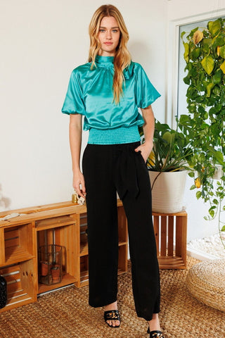 Imported S.M.L Waist smocked solid satin blouse featuring mock neck bow detail, and puff elbow sleeves. 100% Polyester Turquoise ODD