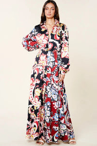 ImportedS.M.L.XLCOLOR BLOCK PRINTED V NECK DRESS.��FRONT SLIT.��POCKETS.��ELASTIC WAIST.��SILK LIKE MATERIAL100% Polyester��Black/Burgundy��QMP