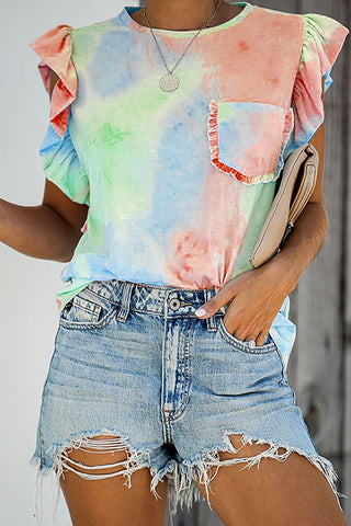 Ruffled Printed Round Neck Cap Sleeve T-Shirt Sale