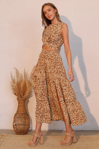 Product Description: Bold and free-spirited, the Wild Babe Tiered Maxi Skirt brings effortless drama to your wardrobe. Crafted from lightweight polyester, this sweeping skirt features the striking Wild Babe print in a flowy, tiered silhouette that moves with ease. Ruffle detailing adds soft texture, while a side slit introduces a touch of allure. Designed for versatile styling, it pairs perfectly with the matching top or simple staples for a standout look that transitions from day to night. Made in the U.S.A., it’s a statement piece with undeniable flair.