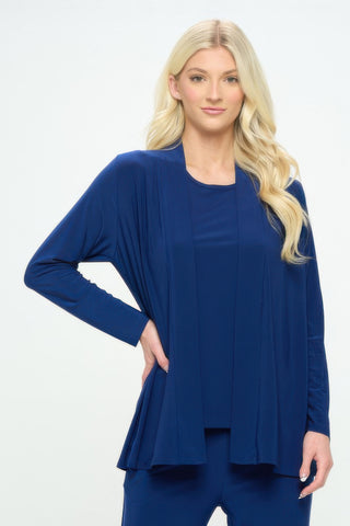 Product Description: This long sleeve cardigan offers effortless layering with a soft, draped fit. Whether worn open or styled loosely around the waist, it brings flow and movement to any outfit. Made from a stretch-knit blend, it provides comfort and structure without added weight. Ideal for cooler evenings or transitional weather, it complements dresses, tanks, or tees with ease. This versatile piece adds a relaxed polish to your wardrobe staples.