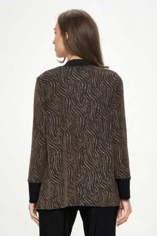 Product Description: Bring shimmer to your layering game with the Glitter Nylon Contrast Jacket. Crafted in a black base with a metallic glitter print, this draped silhouette flatters every shape while offering a soft, comfortable fit. Designed with long sleeves and a modern open front, it's a standout piece made in the USA.