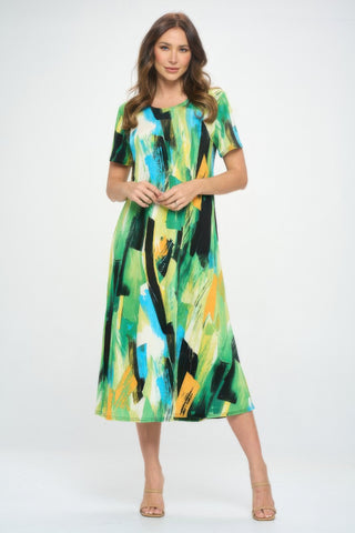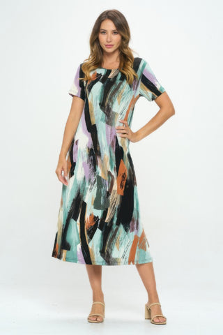 Product Description: This brushstroke print long dress blends artistic flair with everyday comfort. Designed with a scoop neckline and soft drape, it offers an easy, relaxed fit that flatters without clinging. The wrinkle-resistant fabric makes it a top pick for travel or busy days when you want to look polished with minimal effort. Each piece features a unique placement of the bold brushstroke print, ensuring no two are exactly alike. Whether styled with flats or a light jacket, this dress is a standout essential.