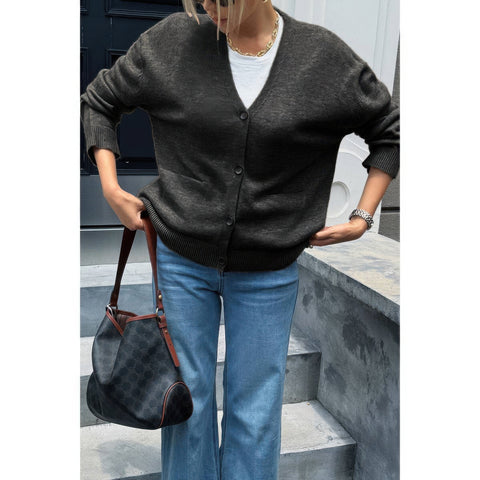 Product Details: 45% Acrylic, 25% Polyamide, 30% Polyester V-neckline with front button closure Soft knit fabric with two side pockets Relaxed fit for easy styling and comfort