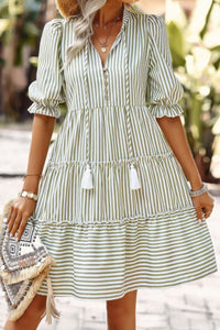 Product Description: The Strip V Neck Button Puff Sleeves High Waist Dress offers a charming and comfortable option for any day of the week. Made from a soft and comfy material, this dress combines a flattering high waistline with playful puff sleeves and a button-down front. The striped design adds a classic touch, while the V-neckline creates an elegant and elongated silhouette. Perfect for casual outings, vacations, or relaxed weekends, this dress strikes the perfect balance between style and comfort.
