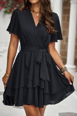 Chiffon Layer Hem Waist Tie Layer Hem Ruffle Dress