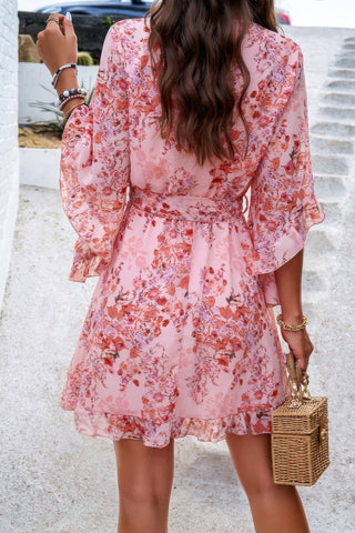 Floral V Neck Waist Tie Ruffle Hem Wrap Dress Sale