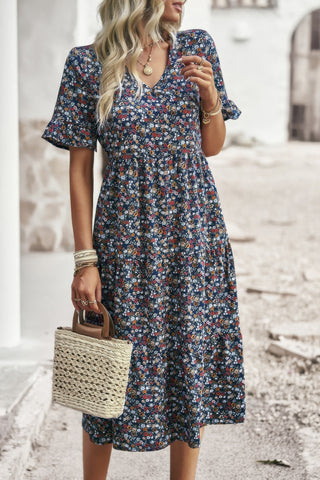 Boho Floral Ruffle Hem V Neck Short Sleeve Dress Sale