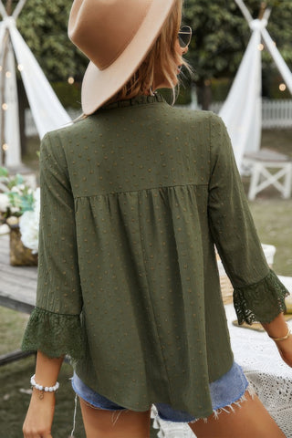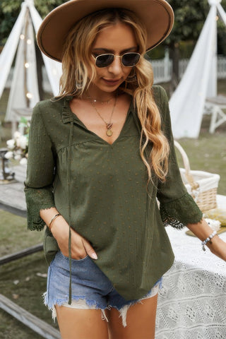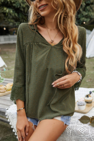 Product Description: Elegant and detailed, this Swiss dot blouse features lace splicing sleeves and a flattering V-neckline for a soft, feminine look. Crafted from 100% polyester, it offers a lightweight, breathable fit that’s perfect for layering or wearing on its own. The delicate Swiss dot texture and lace accents add refined charm, making this blouse a versatile choice for both casual and slightly dressed-up occasions. Whether you're heading to brunch or packing for a getaway, this top brings polished style with a romantic twist.