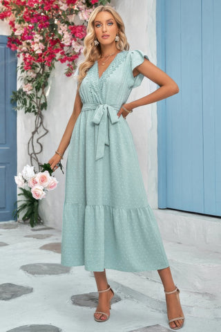 Solid Dot V Neck Lace Ruffle Belt Long Dress - Light Green / S