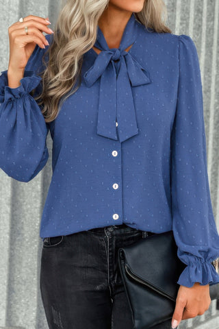 Product Description: This solid Swiss dot neck tie detail blouse brings timeless elegance to your daily style. Made from 100% polyester, it’s lightweight and comfortable, making it perfect for layering or wearing on its own. The charming Swiss dot texture adds subtle interest, while the neck tie detail creates a soft, romantic finish. With its versatile design, this blouse is ideal for everything from workdays to casual parties, pairing effortlessly with jeans, skirts, or tailored trousers.