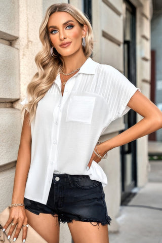 Pleated Solid Short Sleeve Button Down Shirt Sale