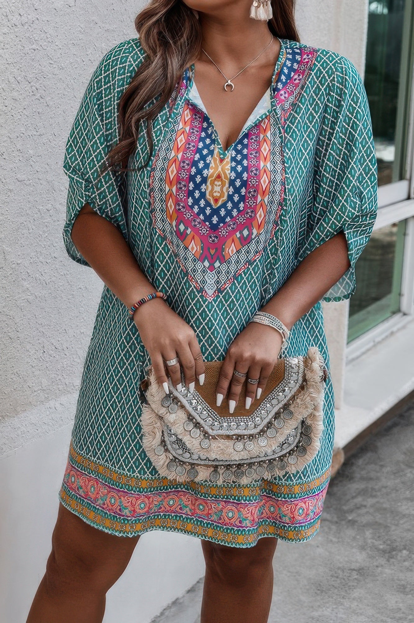 Plus Size V Neck Printed Loose Fit Midi Dress Sale