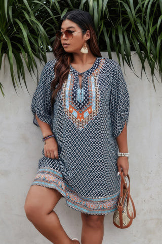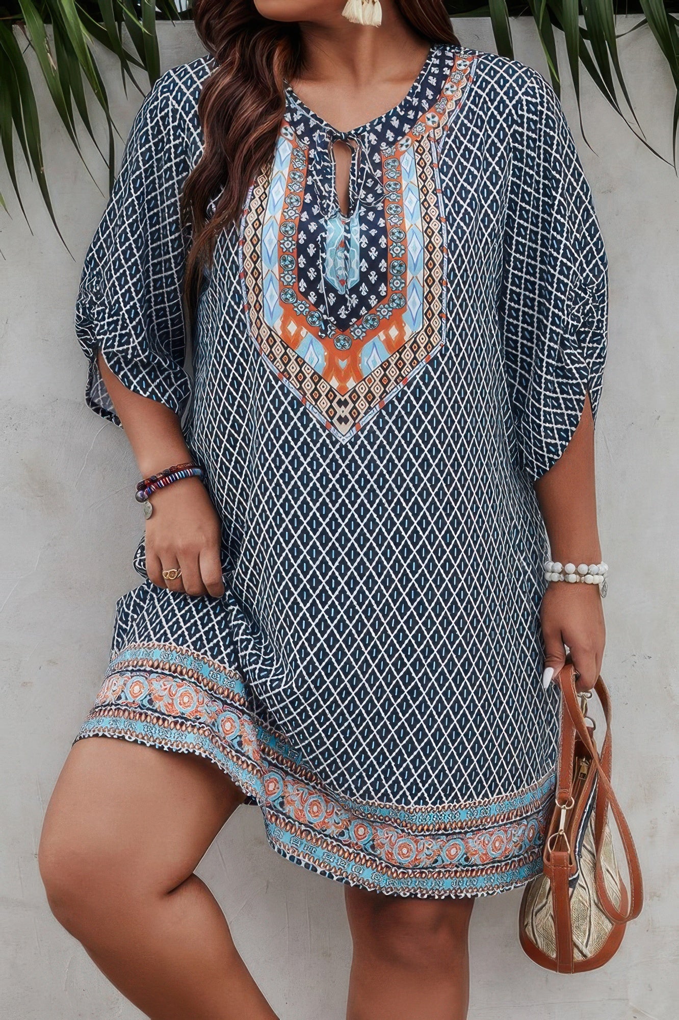 Plus Size V Neck Printed Loose Fit Midi Dress - Navy / 4xl