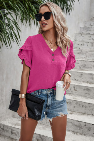Product Description: Feminine and easy to wear, this ruffle V-neck tunic shirt adds a graceful touch to your everyday wardrobe. Crafted from 100% polyester, it offers a lightweight feel and a smooth drape for all-day comfort. The short sleeves and ruffle detailing enhance the classic V-neckline, creating a flattering and polished silhouette. With its solid color and versatile tunic length, this top pairs effortlessly with jeans, leggings, or skirts. Ideal for casual outings, travel, or daily wear, it’s a go-to piece that blends style with comfort.
