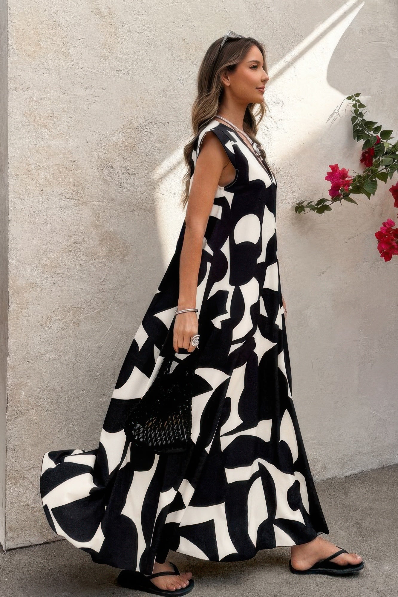 Allover Print Woven Short Sleeve Loose Dress - Black / S