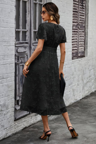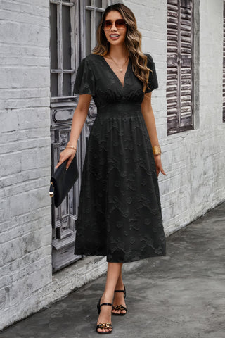 Deep V Ruched Elastic Belt Smocked Midi Dress - Black / S
