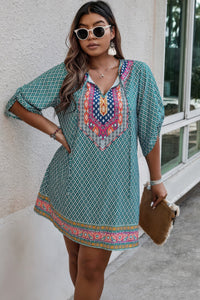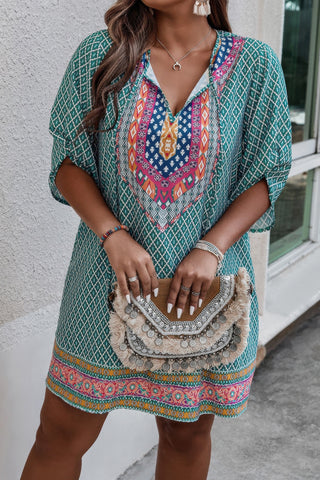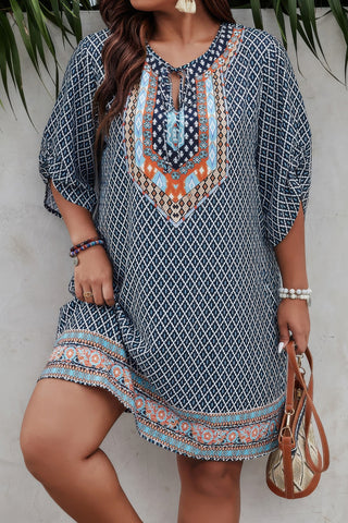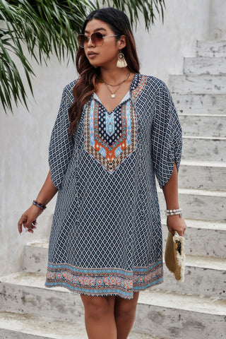 Product Description: The Plus Size V Neck Printed Loose Fit Midi Dress is a breezy and versatile essential for your wardrobe. Made from a comfortable blend of 95% polyester and 5% elastane, this dress offers a soft stretch for an easy, flattering fit. The V-neckline adds a touch of feminine elegance, while the loose fit and flowing midi length provide a relaxed and comfortable feel. With its vibrant printed pattern, this dress is perfect for casual days, outdoor gatherings, or vacations, effortlessly combining comfort and chic style.