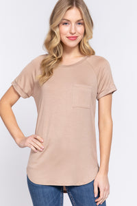 Imported S.M.L SHORT RAGLAN SLEEVE ROUND NECK w/POCKET RAYON SPANDEX TOP 95% Rayon 5% Spandex Khaki ACT