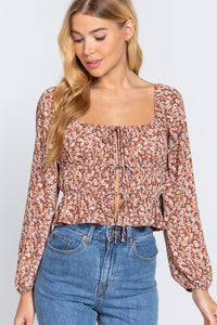 Imported S.M.L LONG SLEEVE SWEETHEART NECK FRONT SHIRRING AND RIBBON TIE DETAIL FLORAL PRINT WOVEN TOP 100% Polyester Mauve ACT