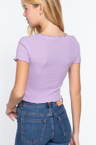 Imported S,M,L SHORT SLEEVE FRONT TIE DETAIL LETTUCE EDGE VARIEGATED RIB CARDIGAN 92% Cotton 8% Spandex Pastel Lavender ACT