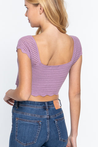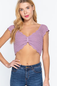 Imported S.M.L SHORT SLEEVE V-NECK FRONT KNOT DETAIL SWEATER KNIT CROP TOP 95% Cotton 5% Spandex Lavender ACT
