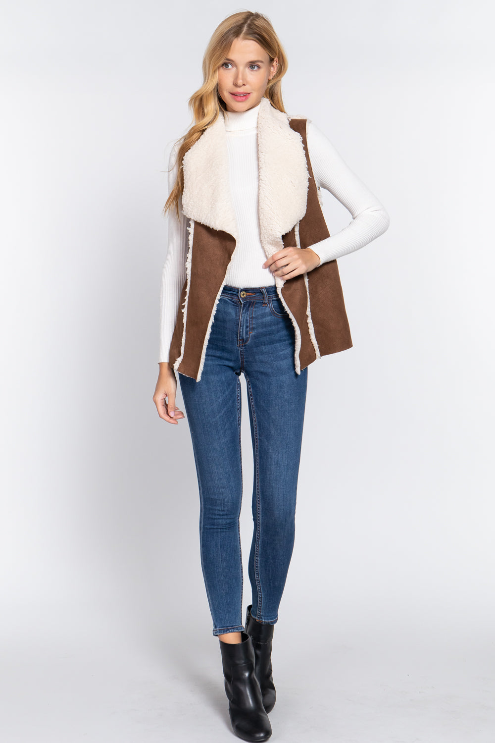 Imported S.M.L SHAWL COLLAR RAW EDGE DETAIL FAUX SUEDE FUR BONDED VEST 100% Polyester Brown ACT