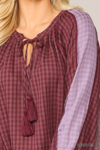 Imported S.M.L Textured Color Mixed Tassel Tie Peasant Top with Reverse Stitch Detail 55% Cotton 45% Viscose Berry Mix GIG