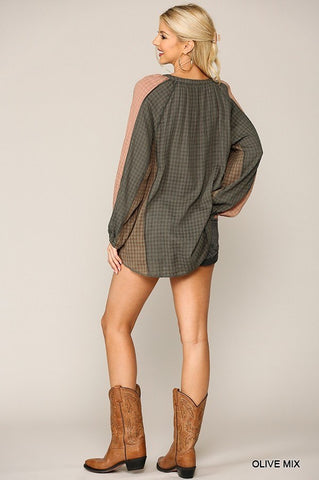Imported S.M.L Textured Color Mixed Tassel Tie Peasant Top with Reverse Stitch Detail 55% Cotton 45% Viscose Olive Mix GIG