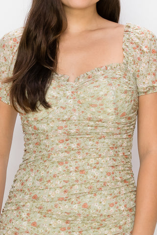 Ruched Floral Ruffled Bodycon Dress