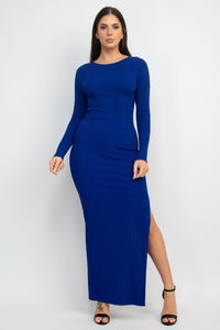 A knit chich maxi dress featuring long sleeves, a round neckline, a side slit, and a bodycon silhouette.