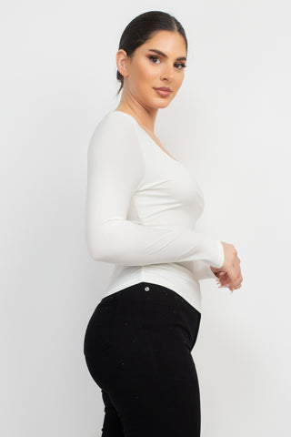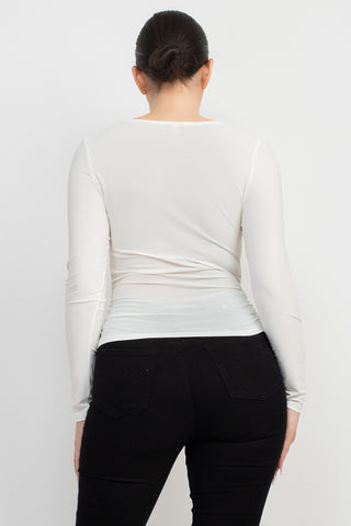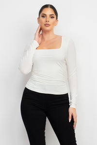 A knit casual top in solid color featuring long sleeves, side ruched detail, a square neckline, a double-layer front, and a waist length.