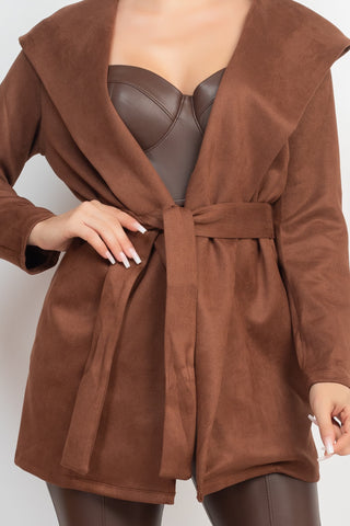 Imported S.M.L A suede outerwear jacket in solid color featuring a hood, waist-tie detachable belt sash, also can be worn open-front and long sleeves 96% Polyester 4% Spandex Brown IRI